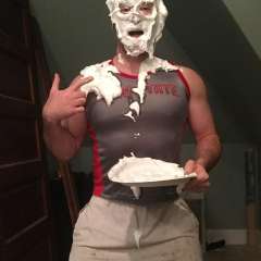 Chuck M was surprised by bsmessybakery with a big sloppy cream pie to the face